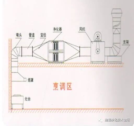 3、安装油烟净化器与烟罩出口位置的距离至少在4m以上,以确保净化效果和消防安全;净化器与风机的距离应该在2m以上比较合适,净化器最好安装在风机的前面,因为风机安装在净化器前面,会导致风机的出风口不能对着净化器直吹,从而影响净化器净化效果;净化器的进风口最好不能有弯头。